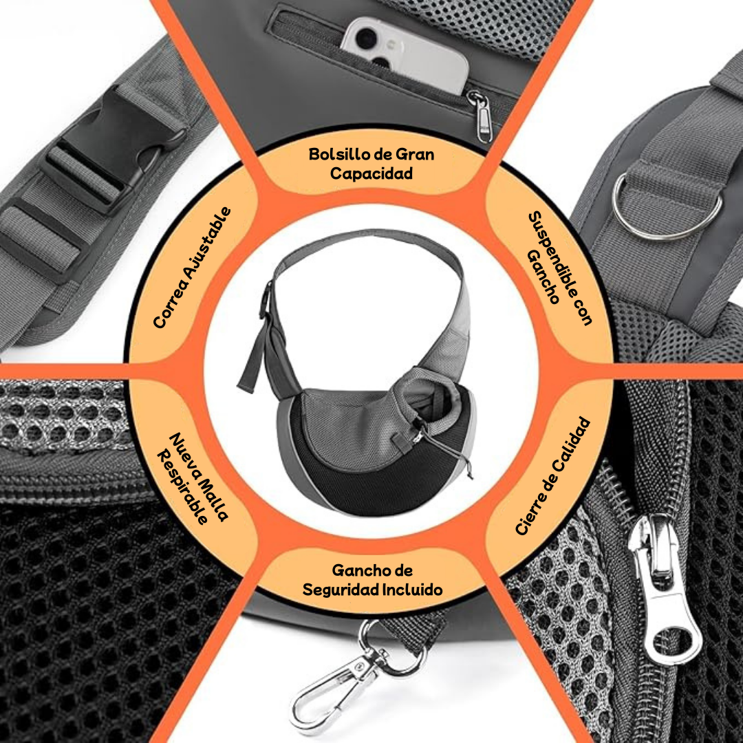 Fabricado con materiales resistentes y suaves, ofrece una experiencia confortable tanto para la mascota como para el dueño. Su diseño ergonómico distribuye el peso de manera uniforme, reduciendo la carga en hombros y espalda. Además, cuenta con ajustes seguros, excelente ventilación y un interior acogedor que brinda tranquilidad en cada paseo, e incorpora dos bolsillos útiles ideales para llevar premios, accesorios u objetos personales.