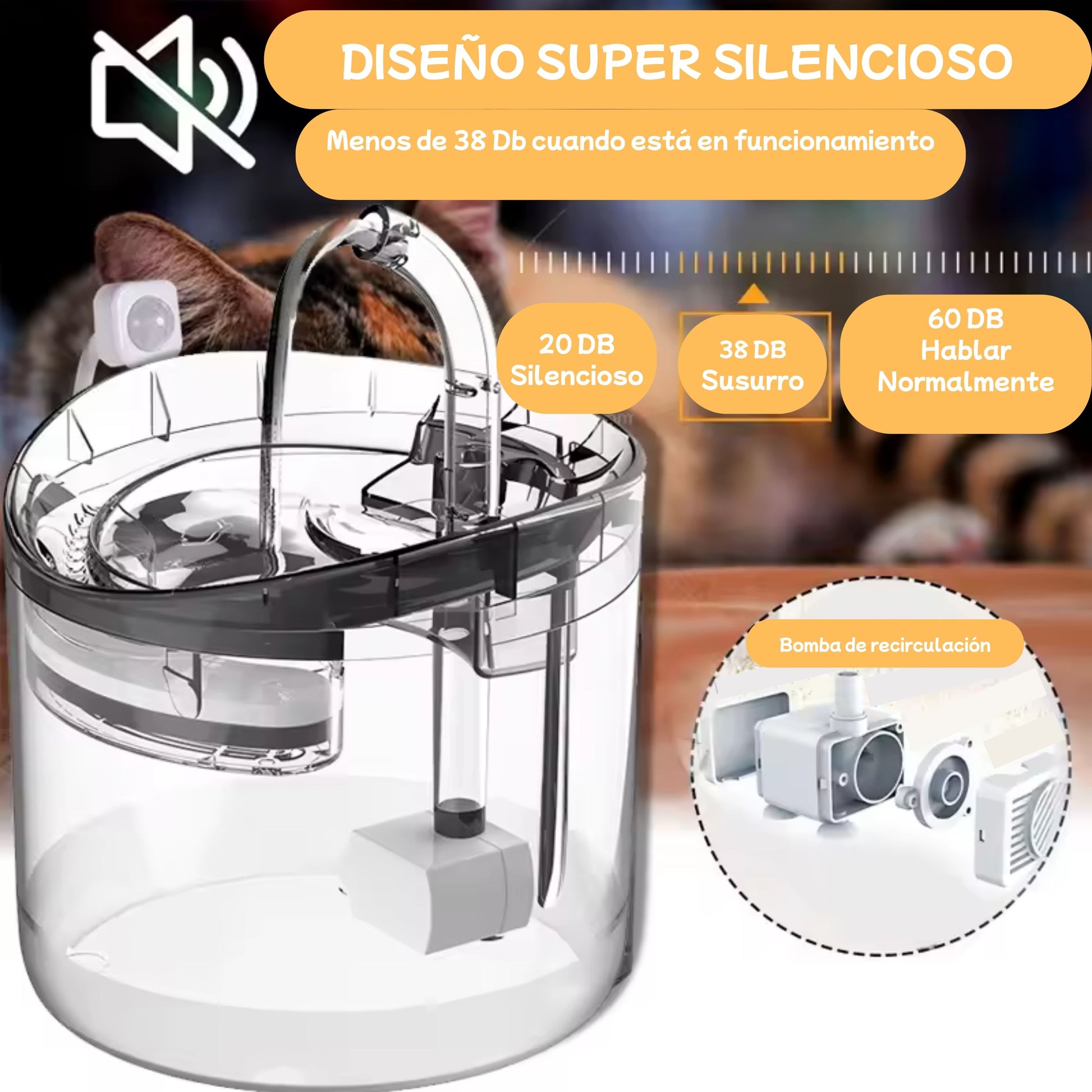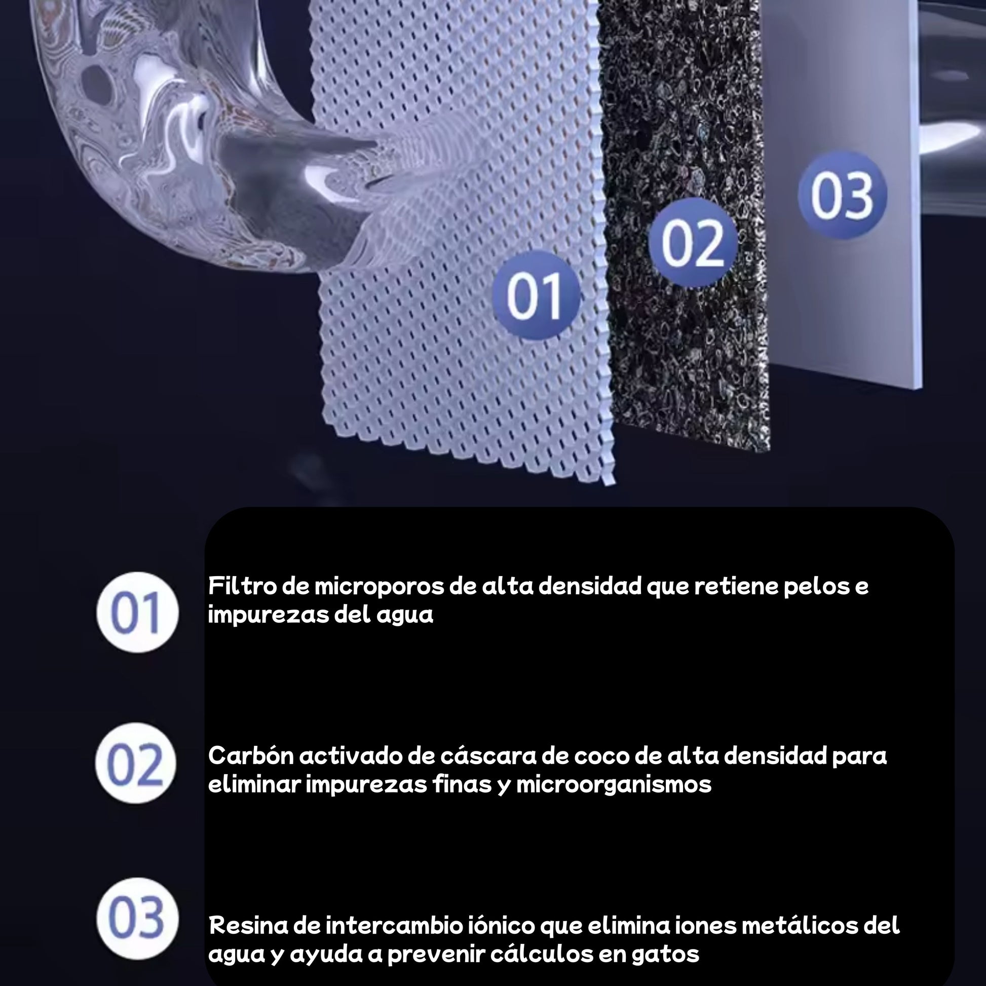 El sistema de triple filtración retiene pelos e impurezas, elimina partículas finas y microorganismos, y reduce los metales del agua, ayudando a prevenir problemas urinarios y cuidando la salud de tu gato.